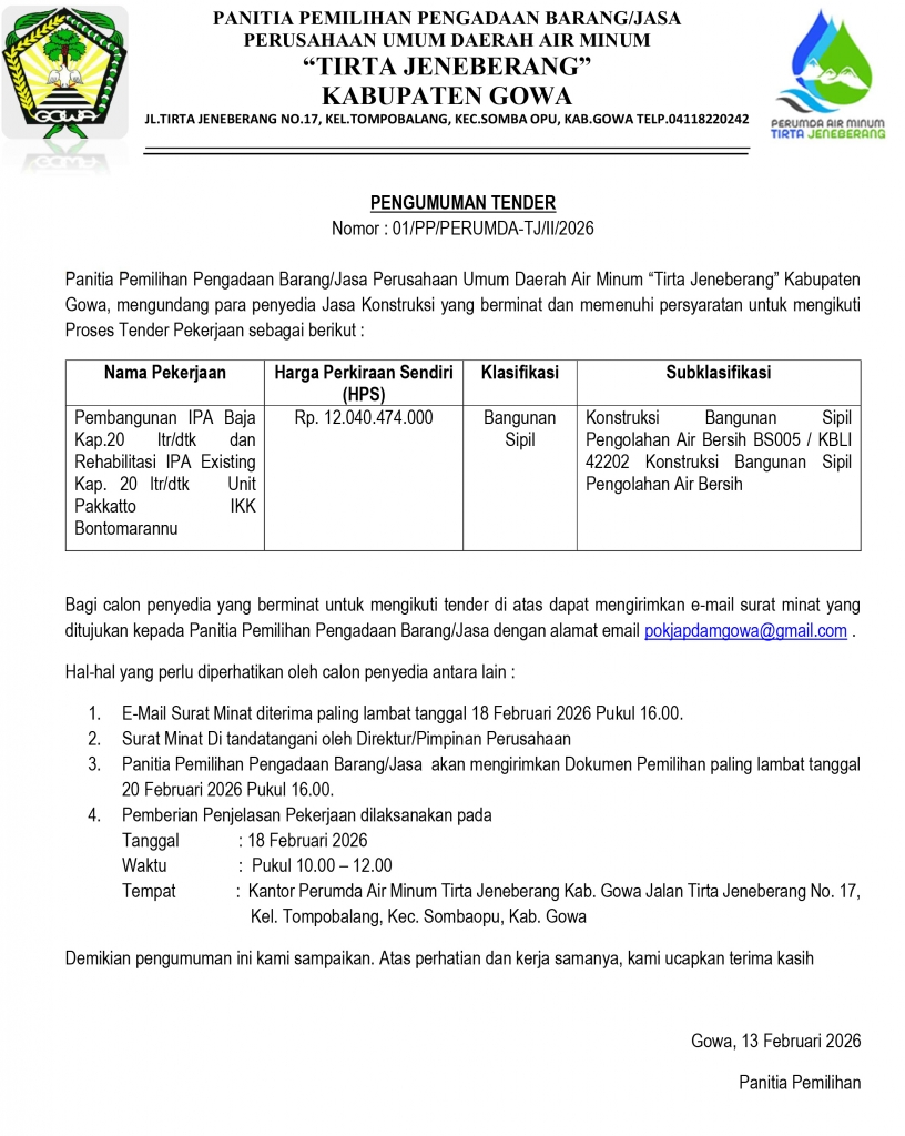 Gowa, 13 Februari 2026 – Dalam rangka peningkatan pelayanan dan pengembangan infrastruktur, Perusahaan Umum Daerah (PERUMDA) Air Minum Tirta Jeneberang Kabupaten Gowa mengumumkan pelaksanaan tender terbuka untuk Pekerjaan Pembangunan IPA 20 Ltr/Dtk dan rehabilitasi IPA Eksisting